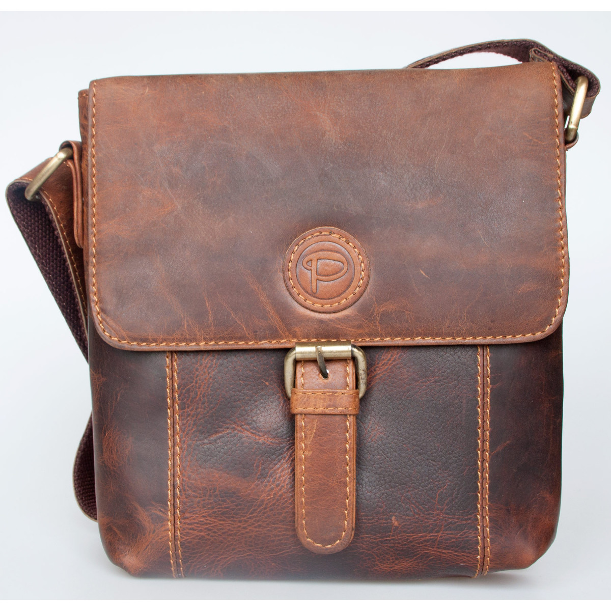 Středně velká pánská taška Pedro z pevné kůže s popruhem přes rameno. Rozměr 22 x 23 cm. Hloubka podle plnosti 6-7 cm.