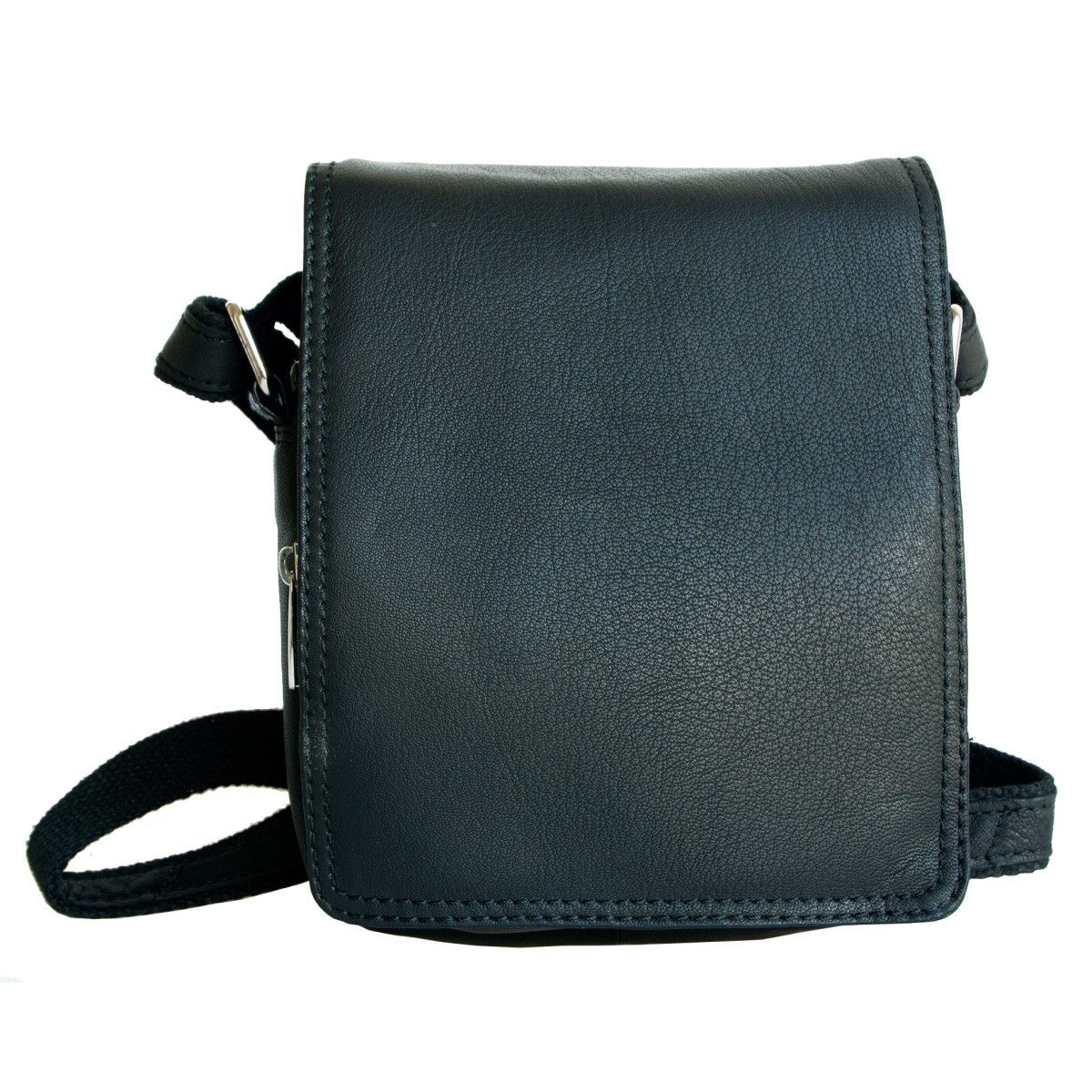 Malá pánská taška z měkké černé kůže s popruhem přes rameno. Rozměr 16 x 19 cm. Tloušťka podle plnosti 6-10 cm.