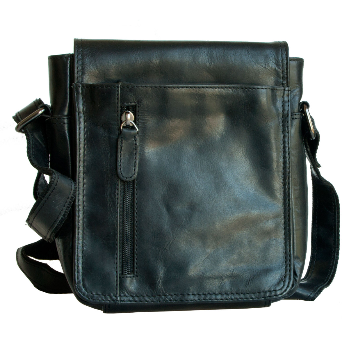 Střední pánská taška ze silné černé kůže s popruhem přes rameno. Rozměr 19 x 21 cm. Tloušťka podle plnosti 6-8 cm.